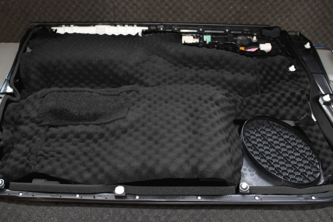 Разобрали двери: сняли дверные карты, удалили пароизолирующую пленку, демонтировали динамики. Тщательно подготовили поверхность к установке материалов. В дверях обнаружили грязь, пыль и влагу. Заводская виброизоляция отсутствовала, из-за чего двери были громкими, что влияло на качество звучания динамиков.